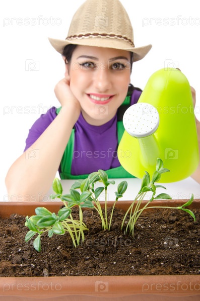 Девушка поливает растения