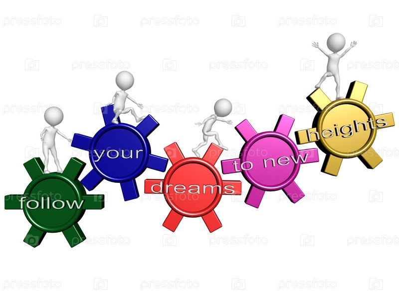 Команда людей, идущих вверх по шестерням со словами "следуйте к вашей мечте, к новым высотам"
