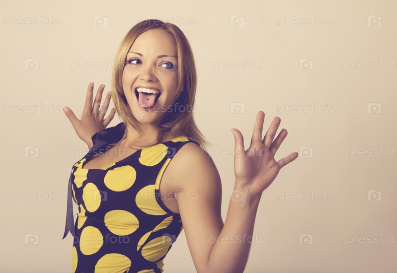 Молодая веселая женщина показывает язык с пирсингом, тонированное в теплых цветах