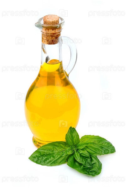 Масло и базилик крупным планом на белом фоне