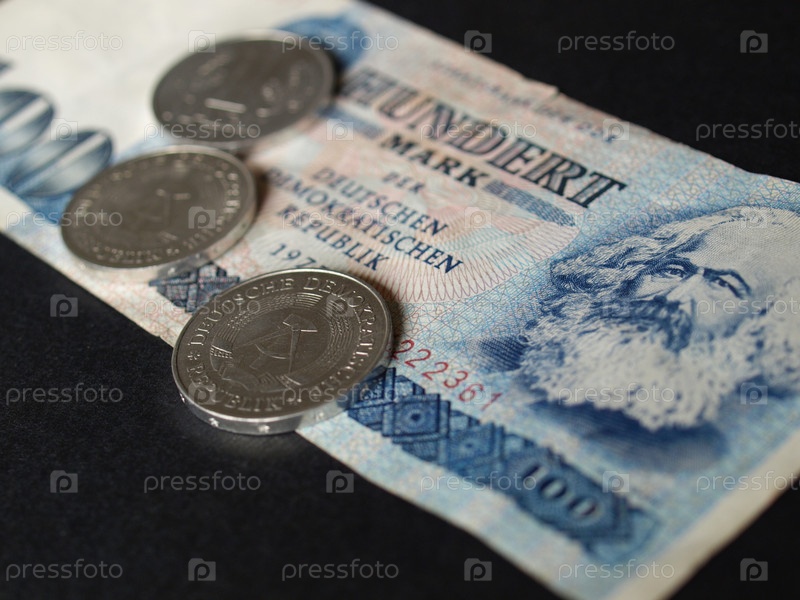 Банкнота достоинством ГДР 100 марок с портретом Карла Маркса с монета достоинством 1 марка, не используемые со времени воссоединения Германии в 1989 году