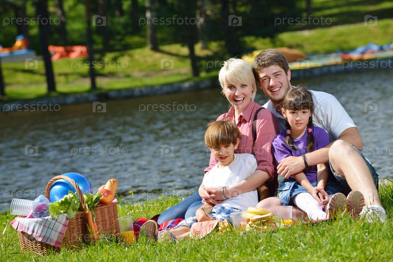 Счастливая семья на пикнике на свежем воздухе