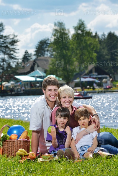 Счастливая семья играет вместе на пикнике на свежем воздухе