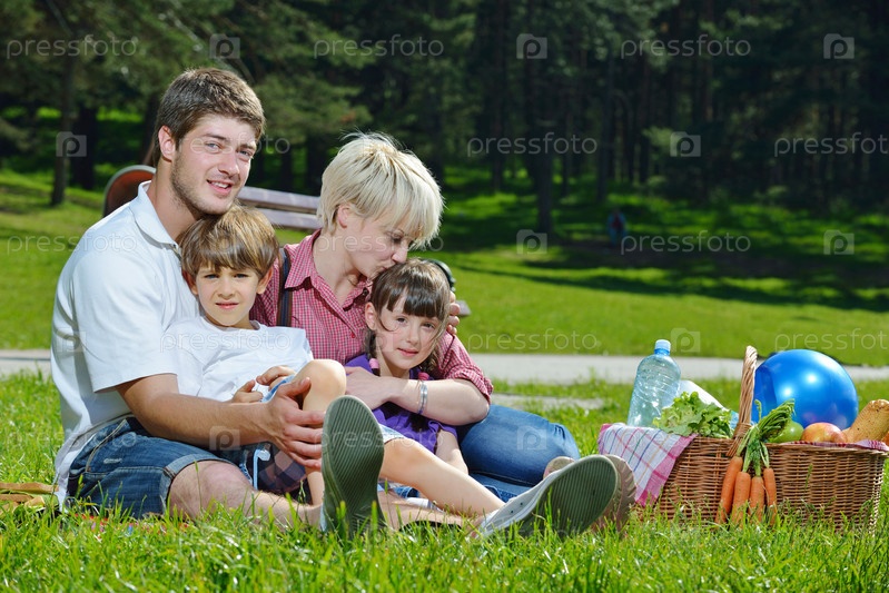 Счастливая семья играет вместе на пикнике на свежем воздухе