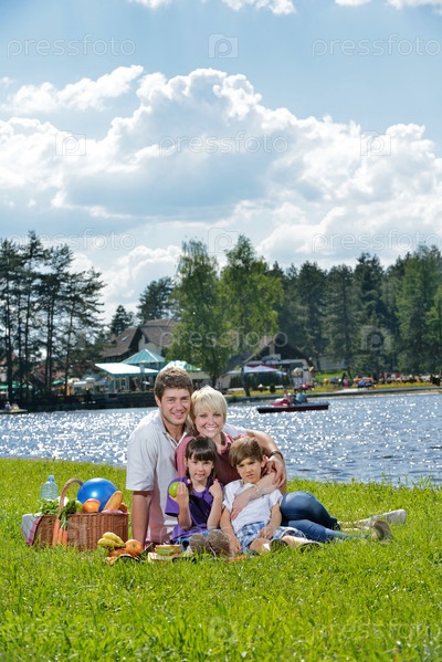 Счастливая семья играет вместе на пикнике на свежем воздухе