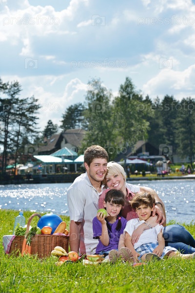 Счастливая семья играет вместе на пикнике на свежем воздухе