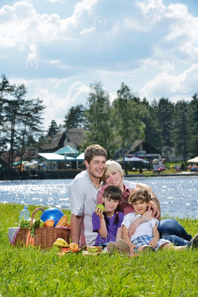 Счастливая семья играет вместе на пикнике на свежем воздухе