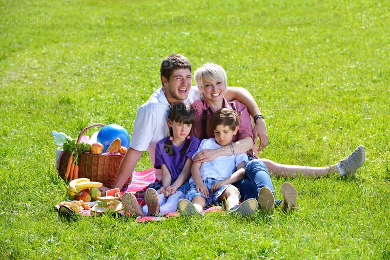 Счастливая семья играет вместе на пикнике на свежем воздухе