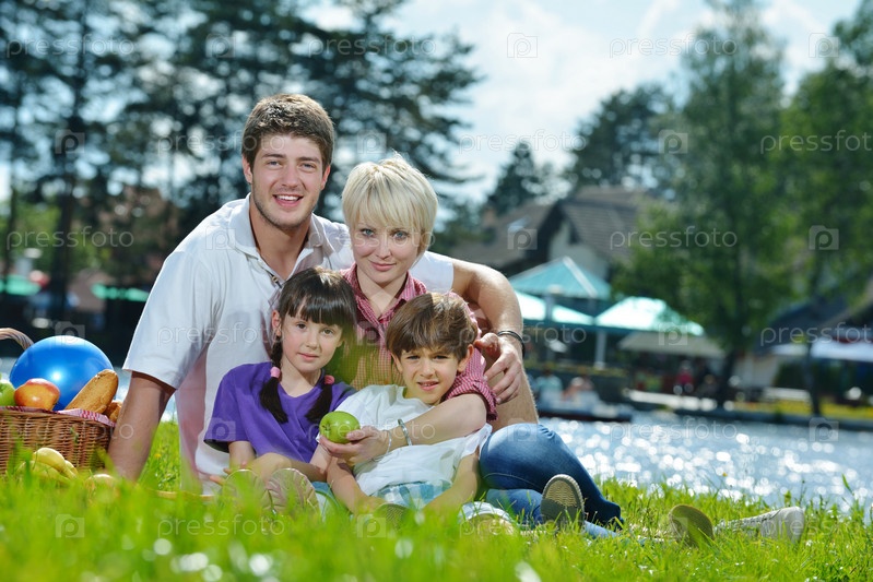 Счастливая семья на пикнике на свежем воздухе