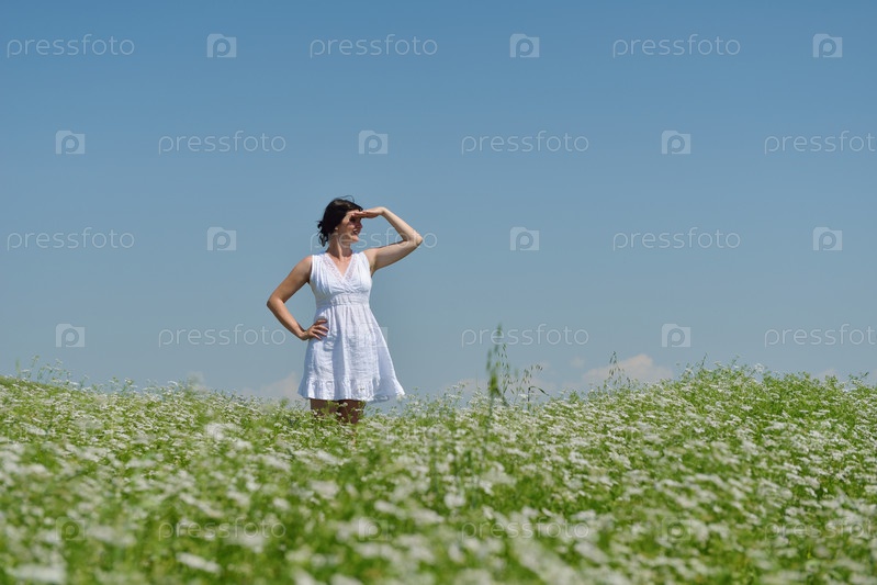 Молодая счастливая женщина на зеленом поле
