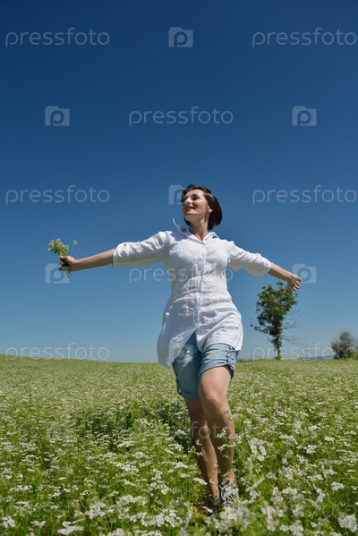 Молодая счастливая женщина на зеленом поле