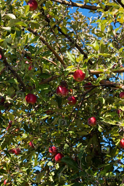 Спелые красные яблоки на ветках
