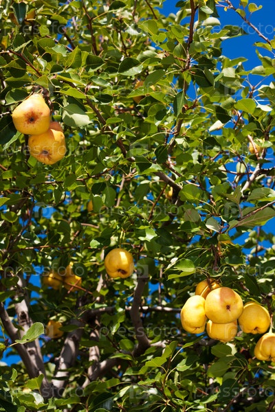 Несколько спелых желтых груш на ветках
