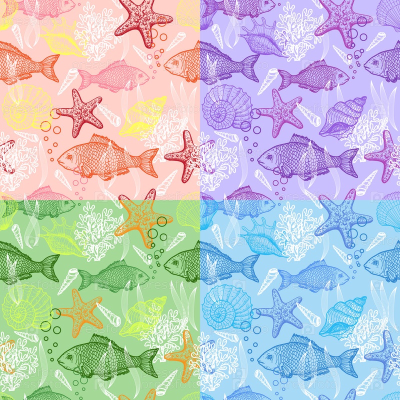 Морской нарисованный от руки бесшовный шаблон. Набор
