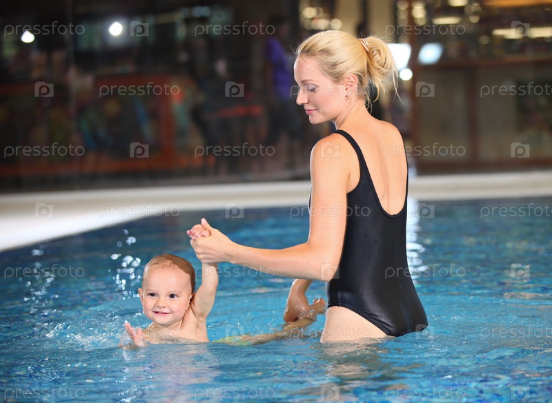 Молодая мать и маленький сын в плавательном бассейне