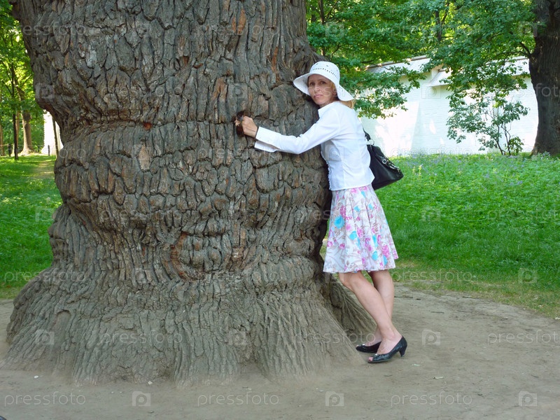 Женщина обнимает ствол старого дуба