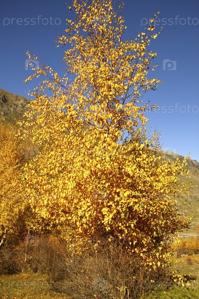 Ярко-желтая береза в горах на фоне неба