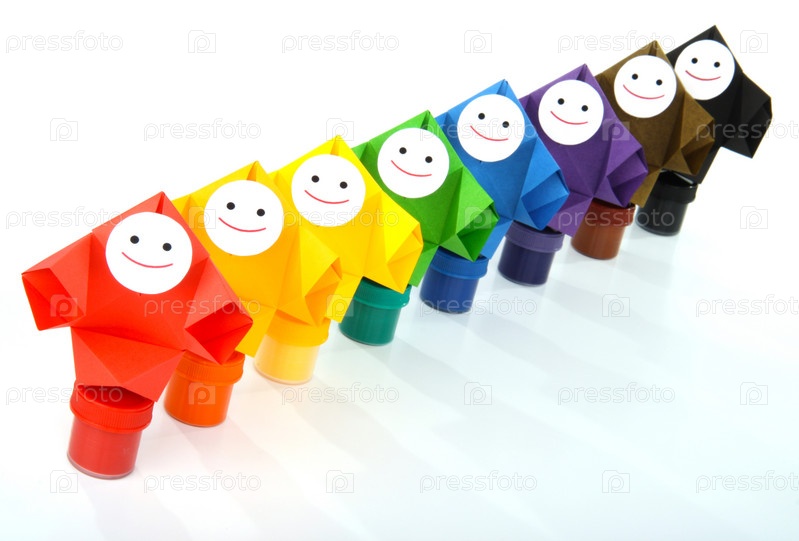 Все цвета радуги. Разноцветные люди-оригами стоят на банках с краской