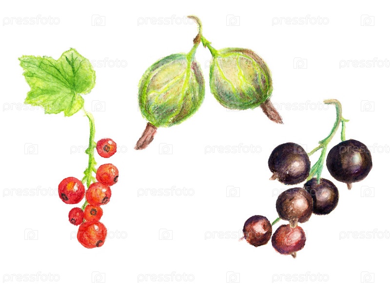 Крыжовник, красная и черная смородина, акварель на белом фоне