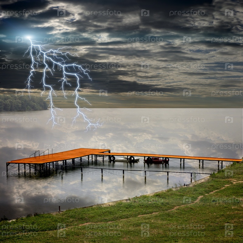 Лодочная станция на красивом озере в грозу