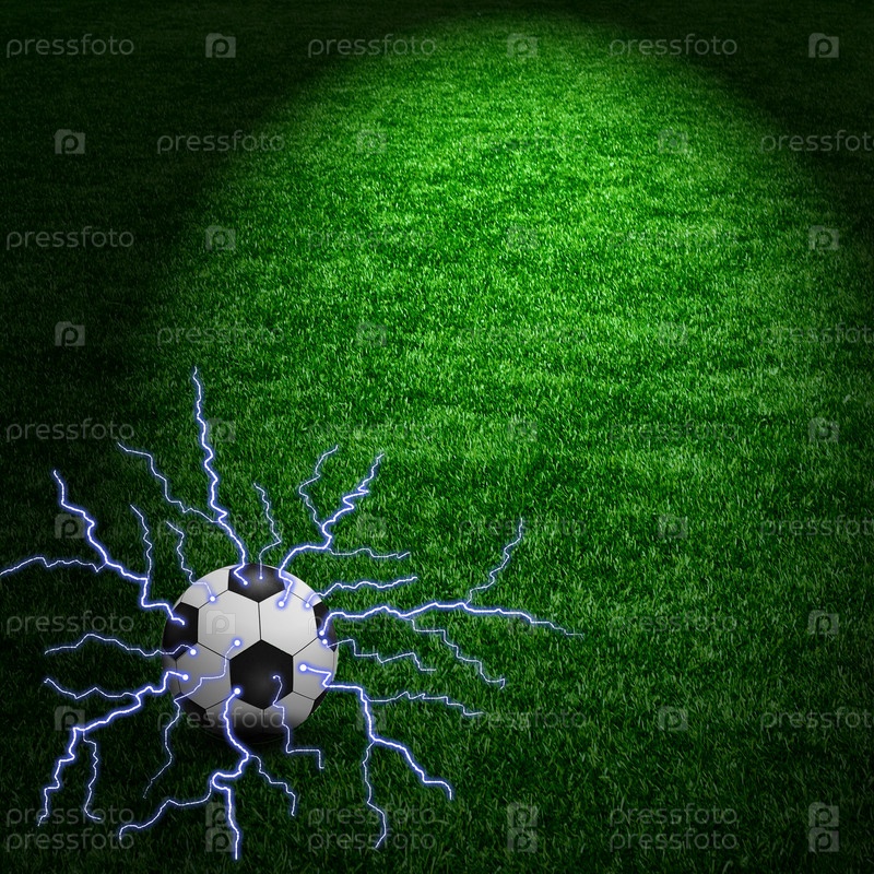 Футбольный мяч с электрическими разрядами на зеленом поле