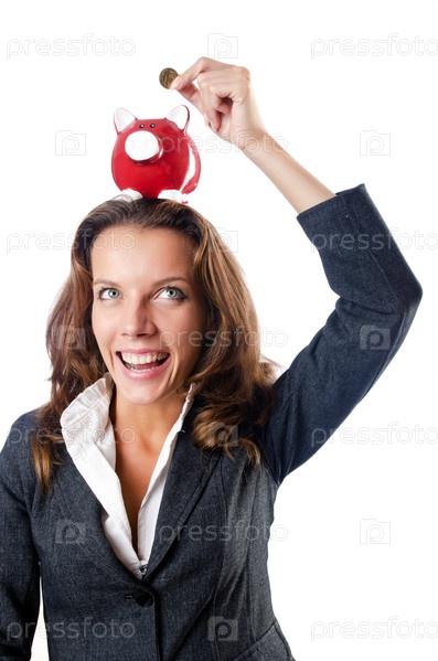 Женщина с копилкой на белом