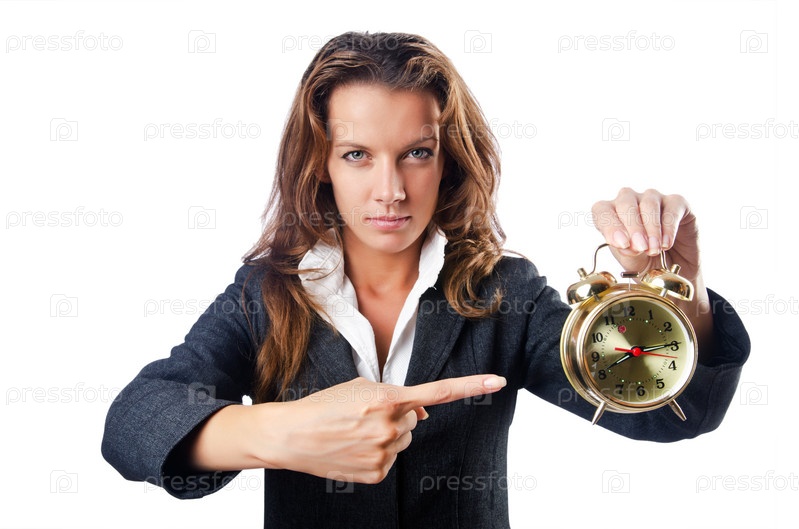 Бизнес-леди с будильником на белом фоне