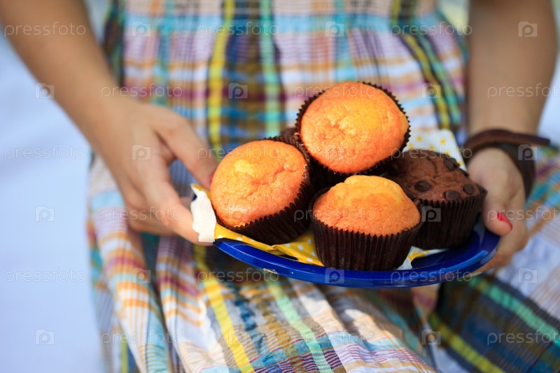 Женские руки с тарелкой маффинов