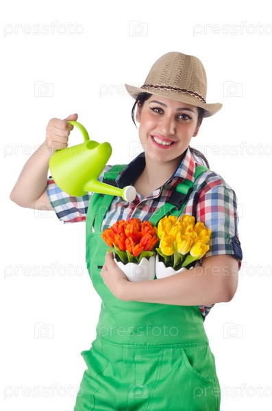 Девушка поливает растения на белом фоне