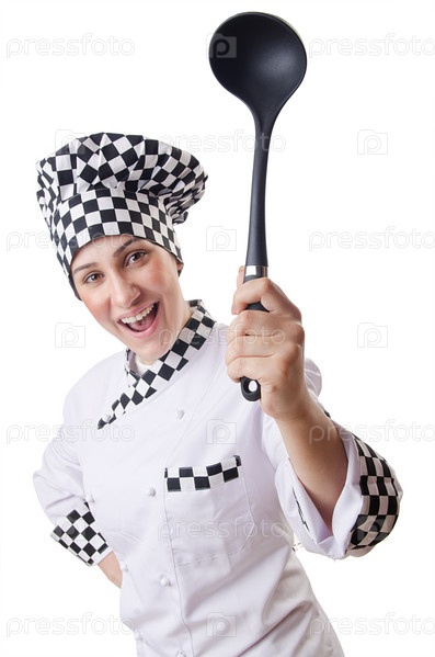Женщина-повар с поварежкой на белом фоне