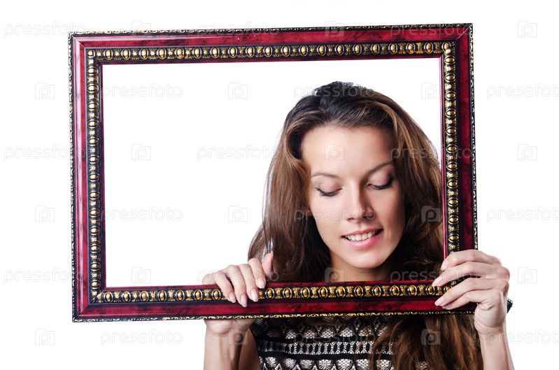 Молодая женщина с фоторамкой на белом фоне