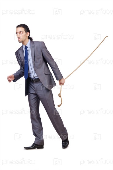 Бизнесмен тянет веревку на белом фоне