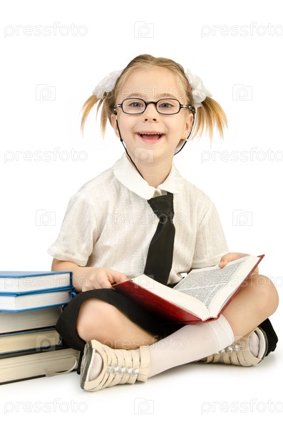 Девочка с книгами на белом фоне