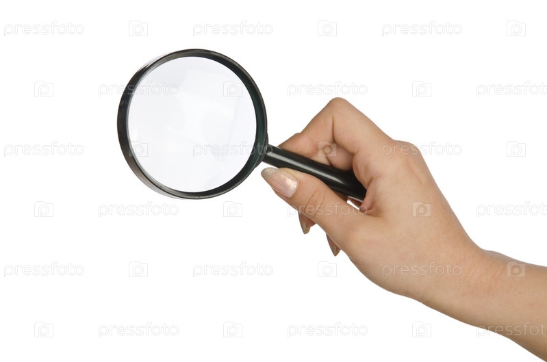 Рука с увеличительным стеклом на белом фоне