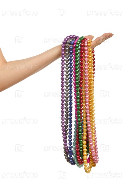 Жемчужное ожерелье в руке на белом фоне