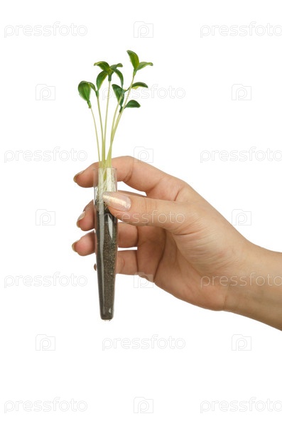 Рука с рассадой в пробирке на белом фоне
