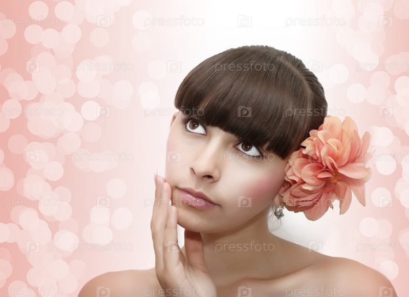 Красивая девушка с цветком в волосах на абстрактном розовом фоне