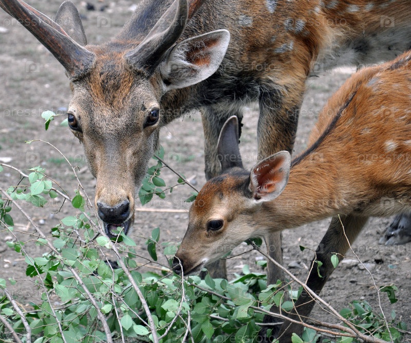 Самка уссурийского пятнистого оленя с олененком едят зеленые листья