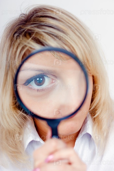 Женщина смотрит через увеличительное стекло