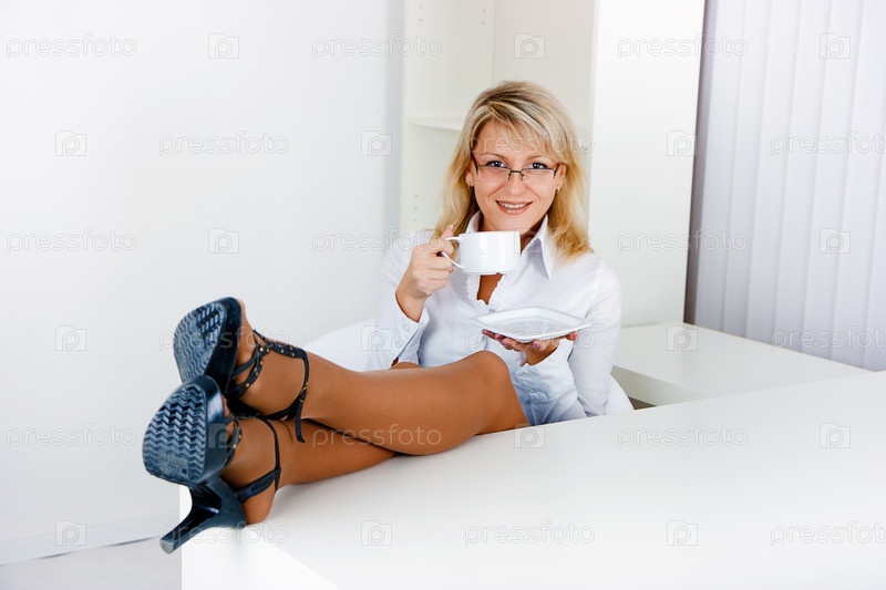 Блондинка пьет чай на рабочем месте