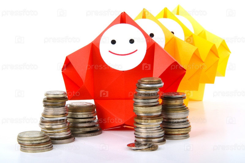 Символическое изображение денег, достатка, сбережений и материального благополучия. Люди-оригами и денежные знаки (монеты и купюры)