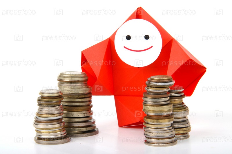 Символическое изображение денег, достатка, сбережений и материального благополучия. Люди-оригами и денежные знаки (монеты и купюры)