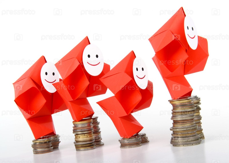 Символическое изображение денег, достатка, сбережений и материального благополучия. Люди-оригами и денежные знаки (монеты и купюры)