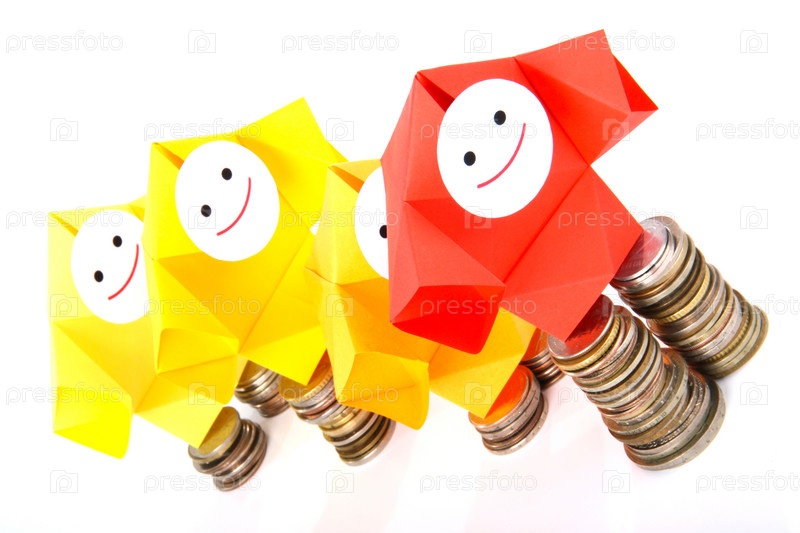 Символическое изображение денег, достатка, сбережений и материального благополучия. Люди-оригами и денежные знаки (монеты и купюры)