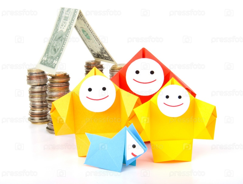 Символическое изображение денег, достатка, сбережений и материального благополучия. Люди-оригами и денежные знаки (монеты и купюры)