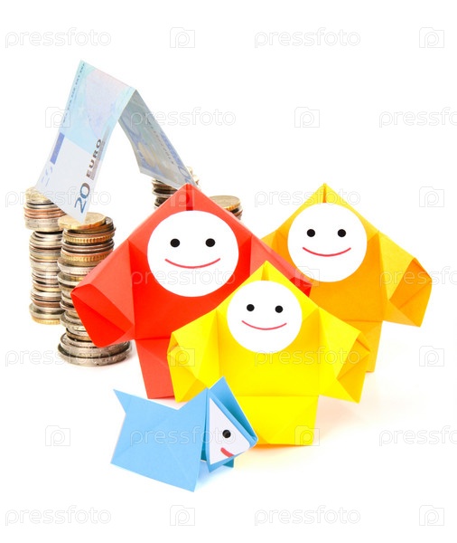 Символическое изображение денег, достатка, сбережений и материального благополучия. Люди-оригами и денежные знаки (монеты и купюры)