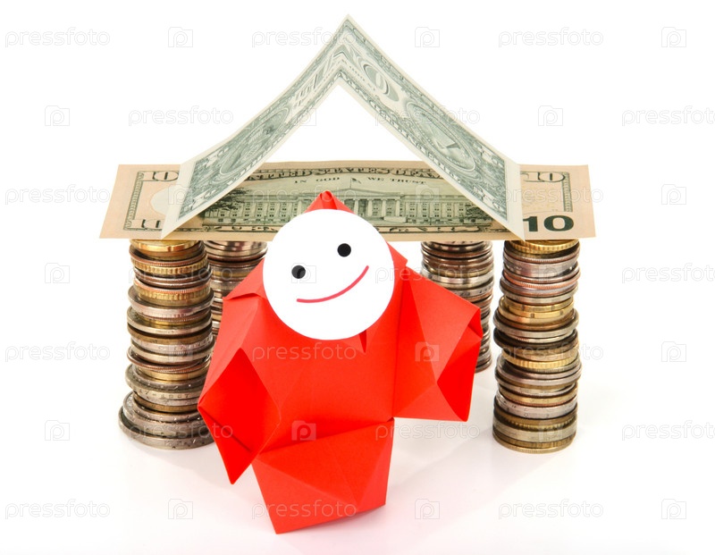 Символическое изображение денег, достатка, сбережений и материального благополучия. Люди-оригами и денежные знаки (монеты и купюры)