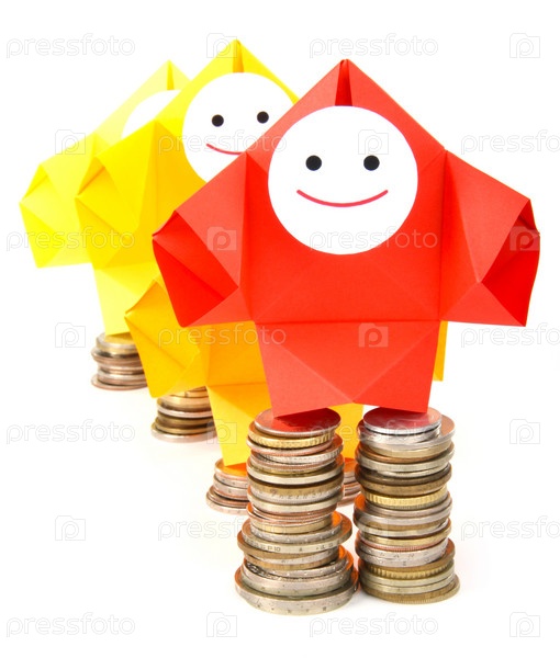Символическое изображение денег, достатка, сбережений и материального благополучия. Люди-оригами и денежные знаки (монеты и купюры)