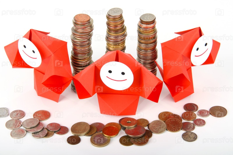 Символическое изображение денег, достатка, сбережений и материального благополучия. Люди-оригами и денежные знаки (монеты и купюры)