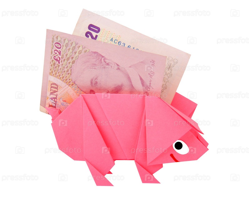 Символическое изображение денег, достатка, сбережений и материального благополучия. Свинка-оригами и денежные знаки (купюры)